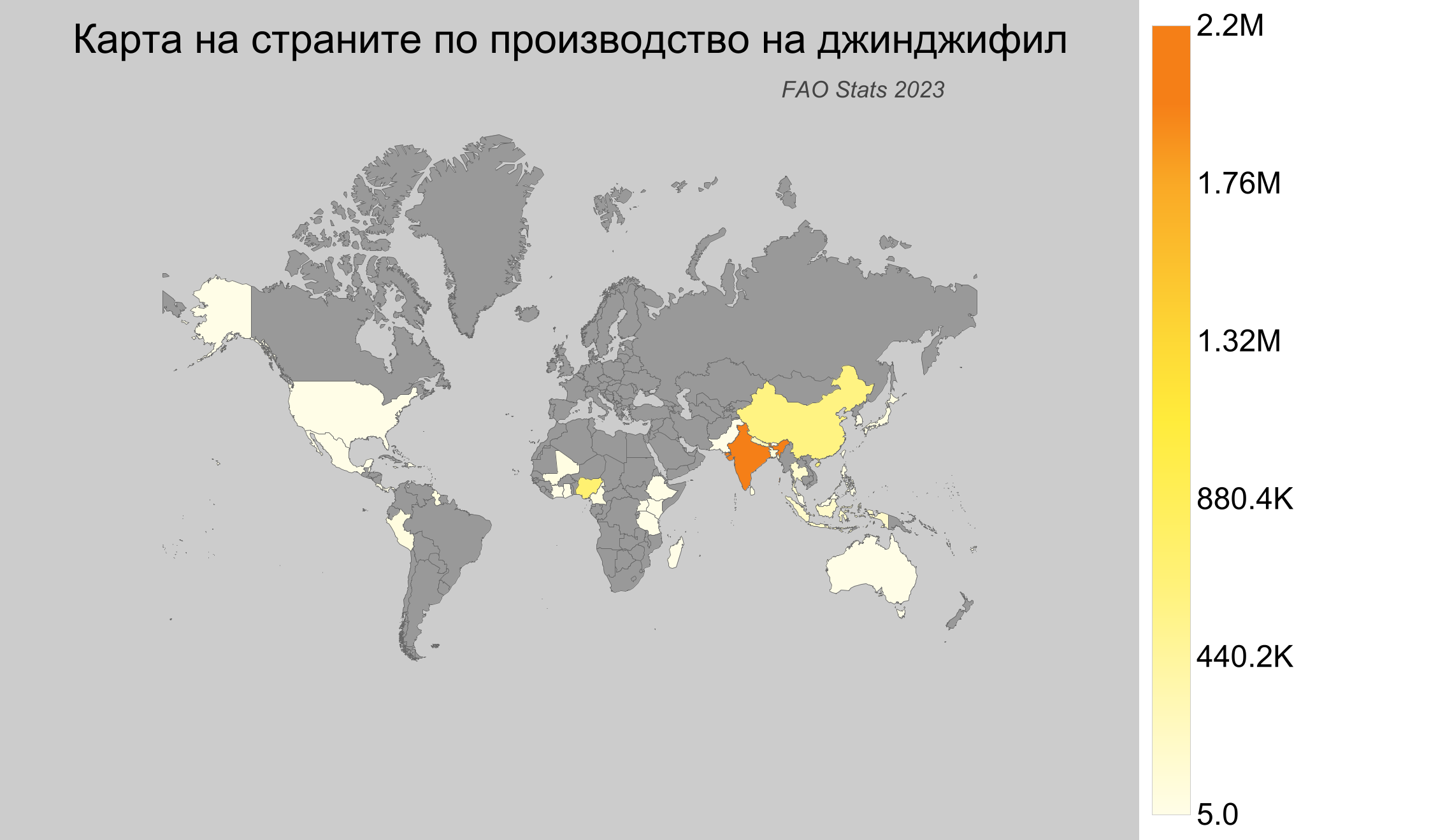 - Голяма част от световното производство се концентрира в няколко ключови страни, като Индия е водеща. България не участва в глобалното производство на джинджифил.