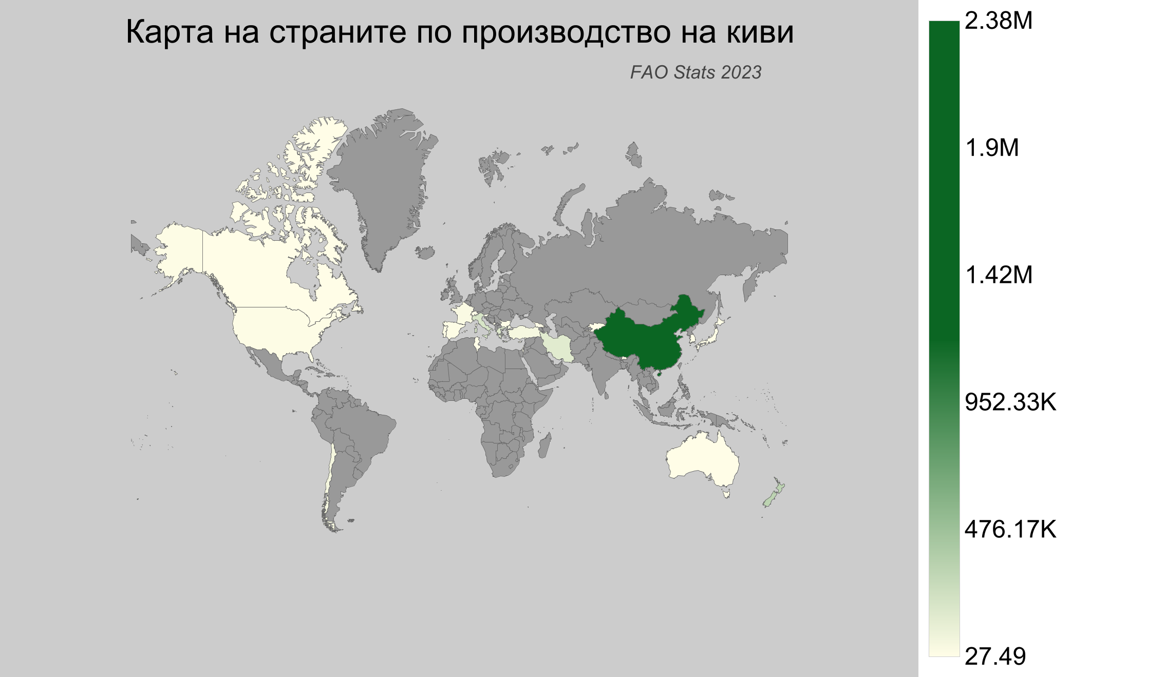 - Китай остава водещ продуцент на киви в света с производство от около 2.38 милиона тона.