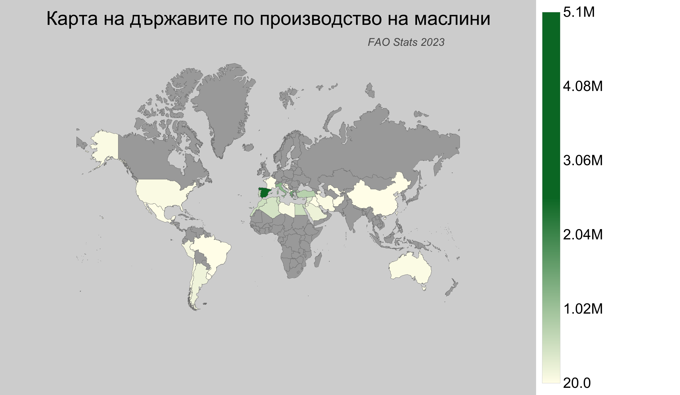 - Испания е водещият производител на маслини за 2023 г., с производство от около 5.1 милиона тона.